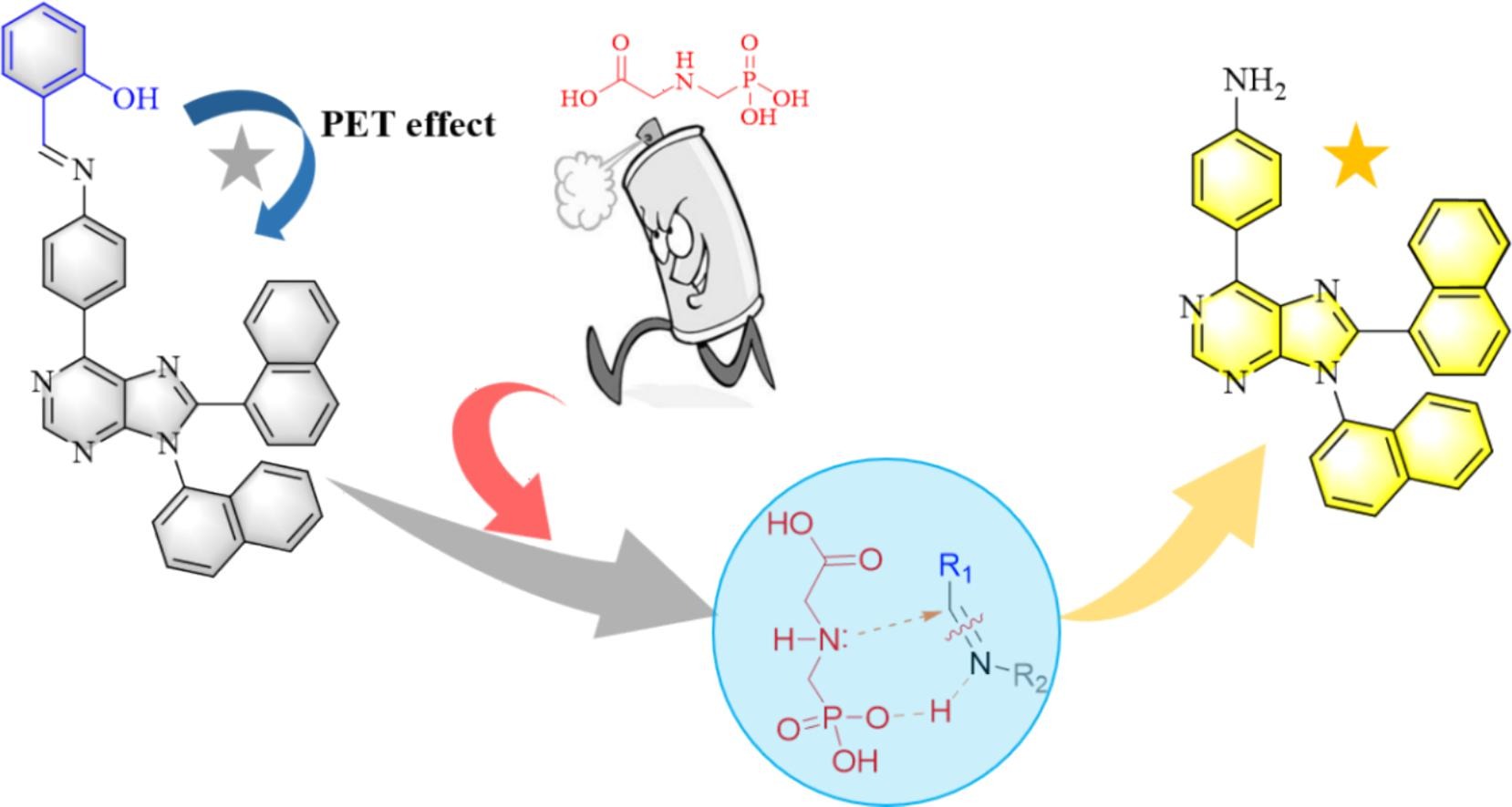 Lu等人开发了一种带有希夫碱分子的嘌呤荧光探针。用于检测草甘膦和间三嗪的定量检测,检测限分别为 17.2 nM 和 484.32 nM。同时,还在实际样品和细胞中进行了草甘膦农药的检测,证明该探针具有良好的实用性和细胞相容性。