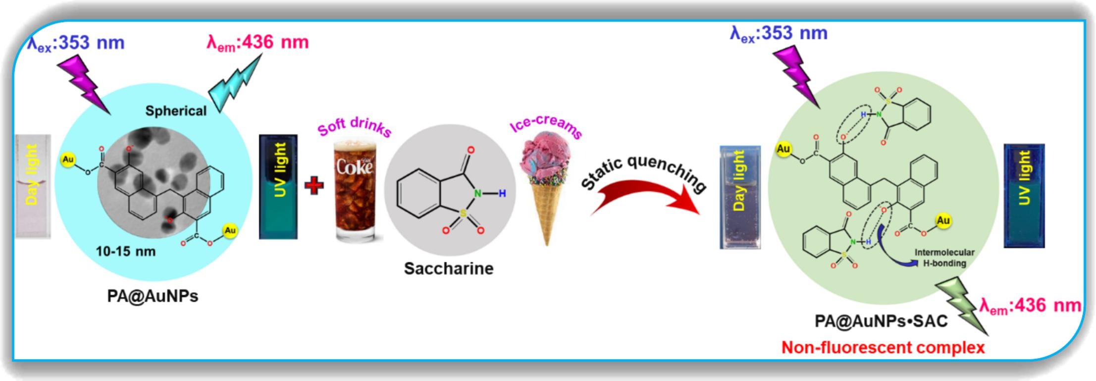 Devaraj等人采用荧光光谱法将PA功能化金纳米粒子(PA@AuNPs)用于检测人工甜味剂,PA@AuNPs 对糖精(SAC)具有高选择性和出色的灵敏度(检出限 LoD = 0.14 × 10-6 M,定量限 LoQ = 0.47 × 10-6 M),PA@AuNPs 能有效检测软饮料和冰淇淋中的 SAC,回收率在 121 % 至 105 % 之间。