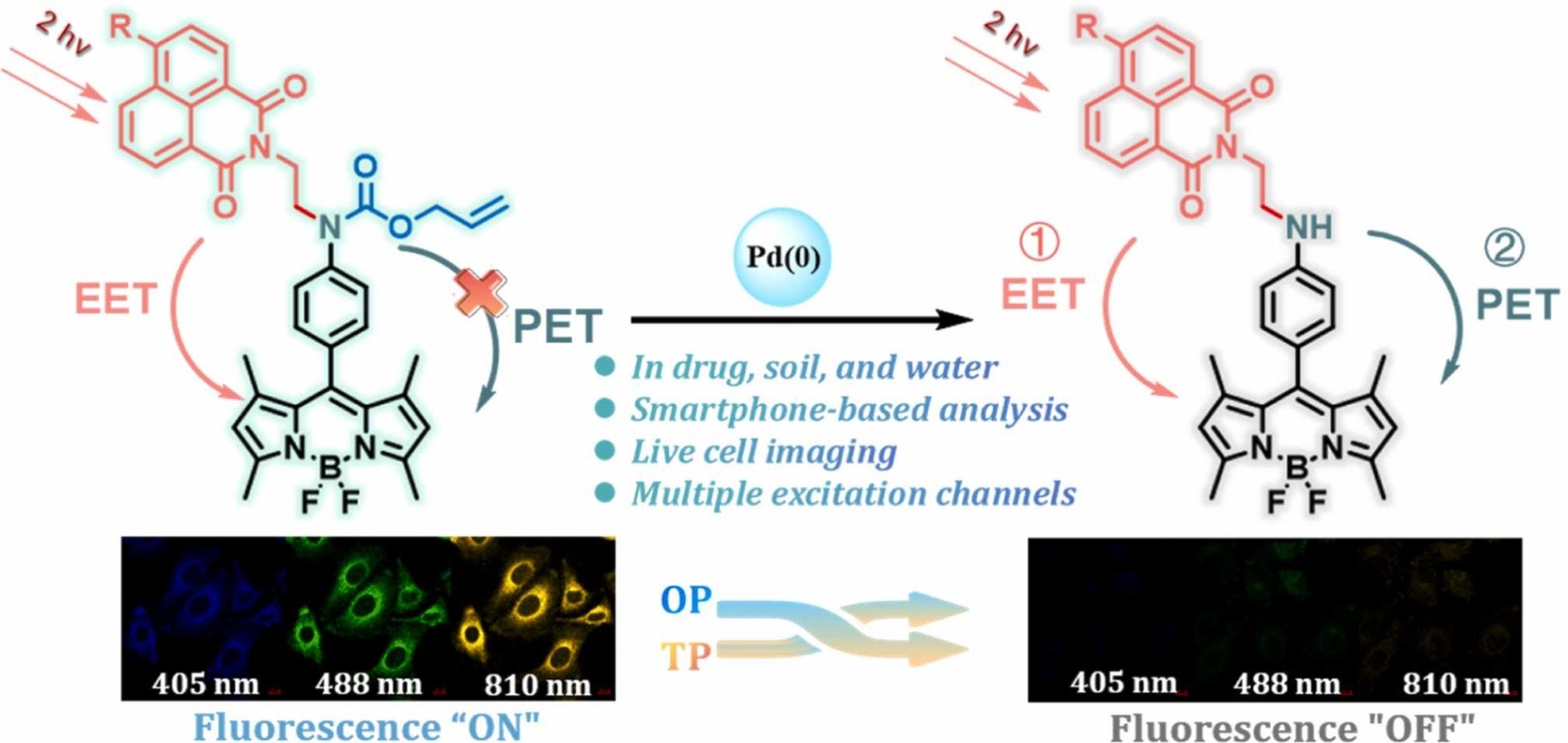 Zhao等人基于激发能量转移(EET)策略,以 NPI 为供能体,BDP 为受能体,开发了两种萘二甲酰亚胺(NPI)-硼-二吡咯烷(BDP)二元体(分别命名为 NBH 和 NBN)作为双光子荧光探针,用于钯(0)的检测。这两种探针都能以明显的荧光 "ON-OFF "方式对钯(0)做出快速反应,检测限低至 2.4 nM。