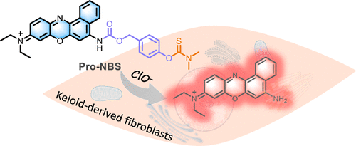 Zhang等人开发了一种特异性荧光探针 Pro-NBS,用于研究瘢痕瘤中的 ClO- 水平。该探针对 ClO- 的特异性高于其他 ROS,并表现出很强的线性检测关系,利用 ClO- 作为内在过表达标记,Pro-NBS在体外和体内都能有效区分正常成纤维细胞和瘢痕瘤衍生成纤维细胞。