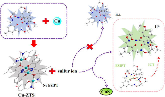 Wei等人设计并制备了一种新的四核铜配合物Cu4(L)22.2CH2Cl2,配合物可以作为复合物探针分子,具有比色和荧光双通道特异性识别能力和优异的抗干扰能力。该探针可通过添加酸性和碱性溶液调节系统的 pH 值,循环多次检测 S2-,适用于大多数生物和环境中 pH 值条件下的离子识别。
