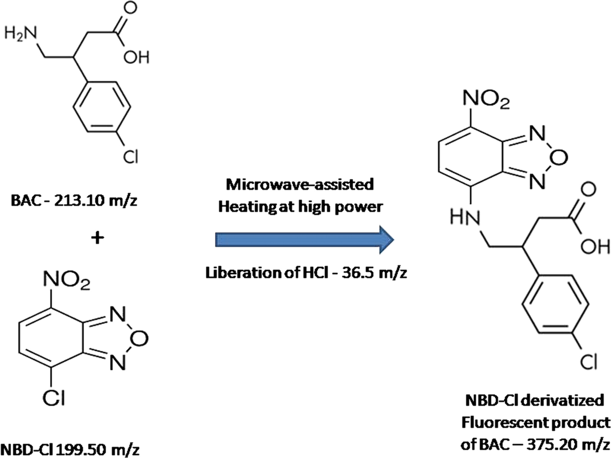 Shah等人利用绿色溶剂和 4-chloro-7-nitrobezofuran 作为荧光探针,开发出了一种可靠的微波辅助光谱荧光测定方法,该方法耗费的溶剂和样品分析时间较少,可用于评估强制降解样品和上市制剂中的巴氯芬浓度。
