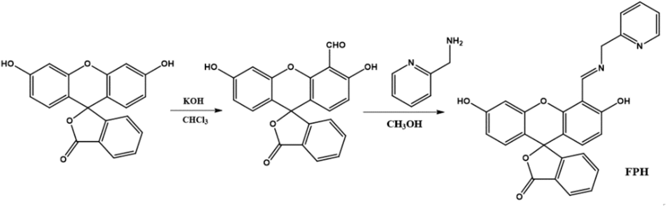 Liang等人设计并合成了一种新的希夫碱荧光探针 FPH,即荧光素一醛(2-氨基甲基吡啶)腙,用于识别 DMSO 水溶液中的 Ca2+,FPH 的线性范围为 0.67 × 10-6 至 3.33 × 10-6 mol/L,检测限为 7.02 × 10-8 mol/L。 探针 FPH 通过增加的亮绿色荧光成功地用于检测活细胞中的 Ca2+。