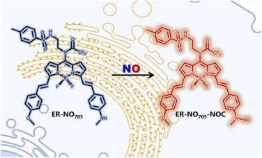 Liu等人报告了一种近红外荧光探针(ER-NO705),用于ER应激时NO动态成像。该探针对 NO 具有超快和高选择性的反应方式,将 NO 与其他生物相关物种区分开来。值得注意的是,ER-NO705 具有极佳的 ER 靶向性,因此可用于在活细胞、斑马鱼和小鼠体内对 ER 压力下的 NO 动态进行时空成像。