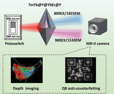 Chang等人开发出了 NIR-I 激活的正交 NIR-IIb/c (1530/1825 纳米)发射纳米粒子(ONNPs)。 RFI 技术和正交 NIR-II 发射 ONNPs 被用于血管深度检测及信息存储的防伪和解密中,展示了 4 × 1 二进制矩阵中光学编码和编码过程的优越性。