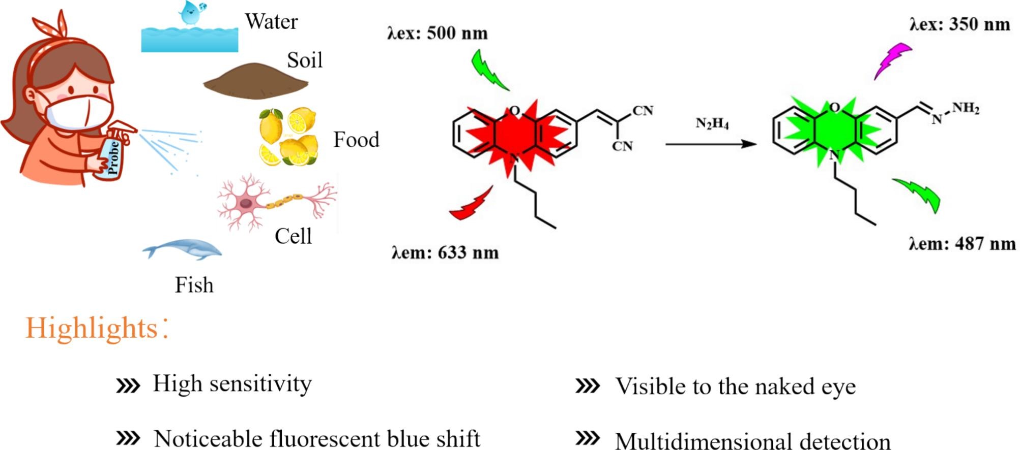 Wei等人介绍了一种新型分子探针(Probe PM)的合成和应用。该探针的特点是合成简单、产量高,并具有极高的灵敏度(检测限低至 17.1 nM),能够用于定性、定量检测和显示各种环境和生物基质(包括水样、土壤样、食品和生物系统)中的肼。