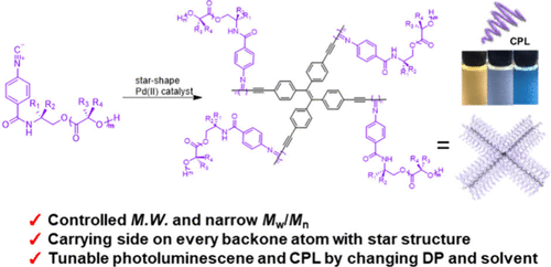Wu等人制备了多种高活性炔钯催化剂,并聚合了含有可聚合苯基异氰基团作为端基的聚(L/D-乳酸)大单体,从而获得了多种拓扑结构的瓶丛聚合物,其分子量可控,分子量分布窄。以四苯基乙烯(TPE)单元为核心的底丛聚合物具有可调的光致发光和圆偏振发光特性。