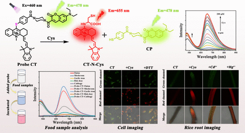 Wang等人开发了一种新型比色和近红外比率荧光探针(CT),由香豆素和四氢吖啶共轭吲哚盐组成,用于检测 Cys。探针与 Cys 反应后,会发生特定的 N 取代反应,从而产生明显的比色变化,并在可见光和近红外发射通道中产生显著的比率荧光响应。这些双通道比率荧光变化是完全独立的,从而使探针获得了极高的选择性、灵敏度和卓越的检测精度。