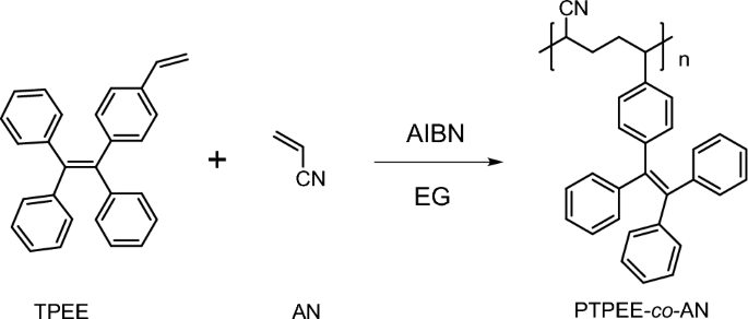 Qiao等人制备了一种(2-(4-乙烯基苯基)乙烯-1,1,2-三基)三苯(TPEE)与丙烯腈(AN)的共聚物(PTPEE-co-AN),并将其用作监测静电纺丝过程的荧光探针。由于物理缠结限制了 TPE 单元的运动,纺丝溶液的 PL 强度随着溶液中 PAN 的增加而增加。因此,PAN 纺丝溶液的粘度和浓度可以通过 PL 强度或假眼来监测。