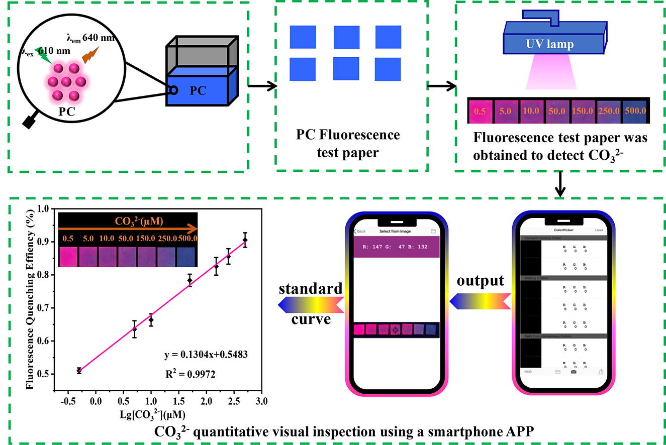 Zhou等人以天然荧光蛋白藻蓝蛋白(PC)为荧光探针,建立了一种响应时间快(50 秒内)、灵敏度高、选择性强的荧光检测方法,用于定量监测 CO32-,该方法的检出限(LOD)为 0.42 μM,并成功用于监测自来水和海水中的 CO32-,回收率在 99.28 % 至 106.40 % 之间。