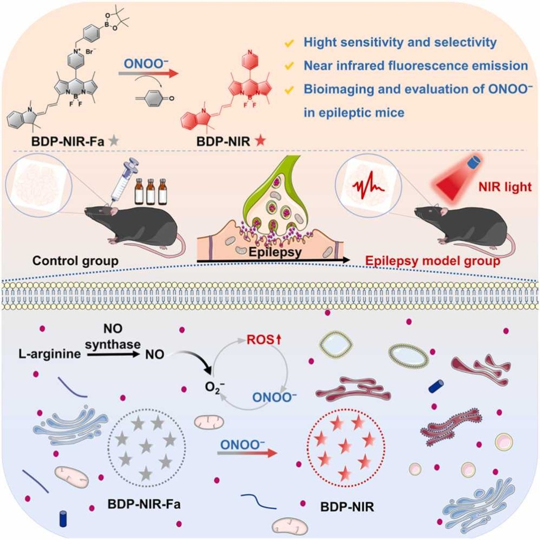 Zhang等人首先构建了含有吡啶基和吲哚啉基的近红外 BODIPY 染料,在 BODIPY 染料的基础上,开发出了新型探针 BDP-NIR-Fa,它在监测 ONOO- 方面具有良好的特异性、更快的响应速度(60 秒)和更高的信噪比(247 倍)。基于这些优良特性,BDP-NIR-Fa 能够追踪活细胞和小鼠体内的内源性/外源性 ONOO- 波动,而不受其他活性氧的干扰。最重要的是,BDP-NIR-Fa 能在 KA 诱导的癫痫发作细胞和小鼠模型中以显著的时空分辨率观察到内源性 ONOO- 的变化,这为癫痫诊断提供了一种潜在的有力工具。
