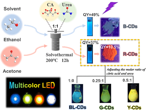 Lin等人利用丙酮作为碳化溶剂,通过一步溶热法研制出了红色固态荧光碳点(SSF-CDs)。调整柠檬酸(CA)和尿素的摩尔比可以得到具有全色发光的固态荧光碳点(CD),这表明π-π相互作用增强,发射峰的红移更明显。此外,作者还发现这种策略适用于其他碳源,包括苯二胺、水杨酸和木质素。这项研究提出了一种制造固态发光 CD 的创新策略。