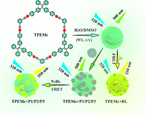 Yi等人以活性铂(II)金属环(TPEMc)为供能体,以 rhodols(P1、P2 和 P3)为受能体,构建了用于检测 N2H4 的人工光收集系统(ALHS)。与单独使用 rhodols(P1、P2 和 P3)相比,基于 ALHS 的 N2H4 比率荧光探针显示出明显的信号放大和较低的检测限。