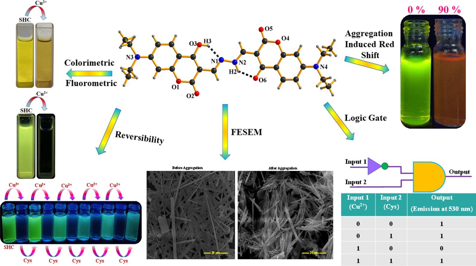 Mathivanan, M.; Malecki, J. G.; Murugesapandian, B. An Interesting Aggregation Induced Red Shifted Emissive and ESIPT Active Hydroxycoumarin Tagged Symmetrical Azine: Colorimetric and Fluorescent Turn on–off–on Response towards Cu2+ and Cysteine, Real Sample Analysis and Logic Gate Application. Spectrochimica Acta Part A: Molecular and Biomolecular Spectroscopy 2025, 326, 125270. https://doi.org/10.1016/j.saa.2024.125270.