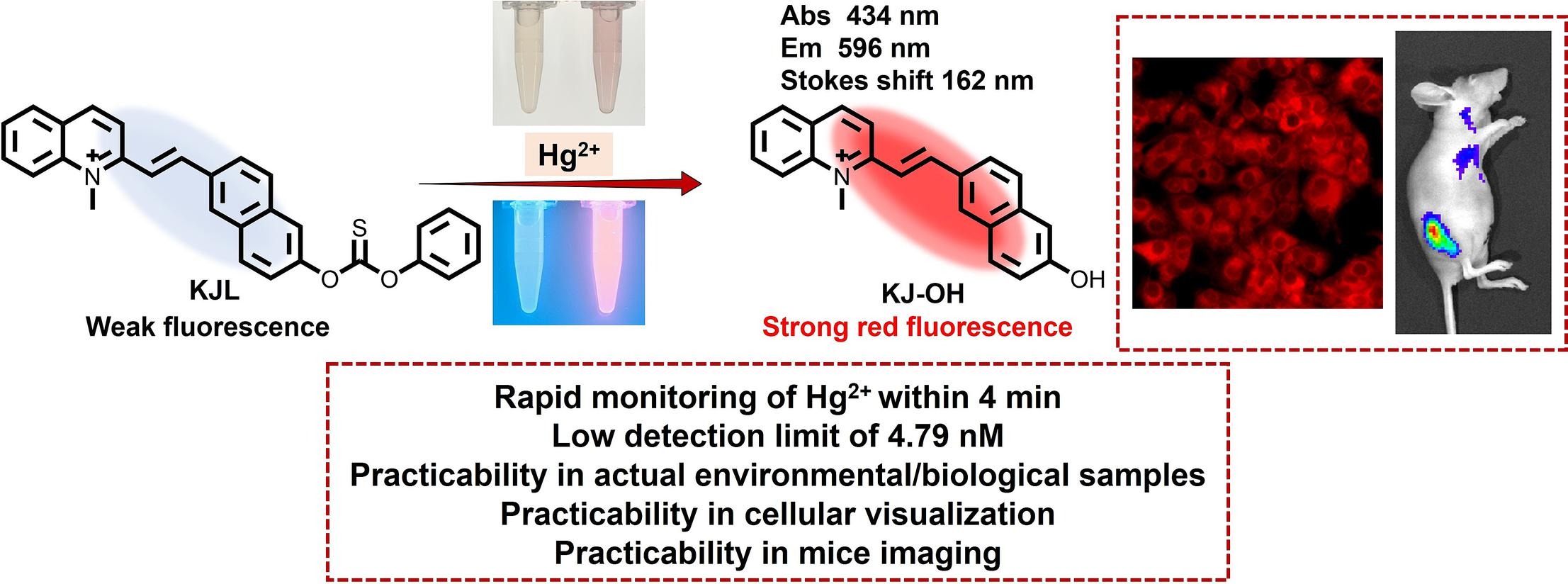 本文介绍了一种新型红色荧光探针KJL,用于检测痕量汞离子(Hg2+)。探针具有快速响应时间(4分钟以内)、红色发射(596 nm)、大斯托克斯位移(162 nm)、高灵敏度(LOD = 4.79 nM)和优异特异性等优点。KJL还验证了其在实际样品(自来水、饮用水、河水、湖水、尿液和血清)中准确监测痕量Hg2+水平的良好能力,并在环境/生物条件下具有显眼的Hg2+可视化能力,显示了该红色荧光探针在复杂环境和生物系统中的实际应用潜力。