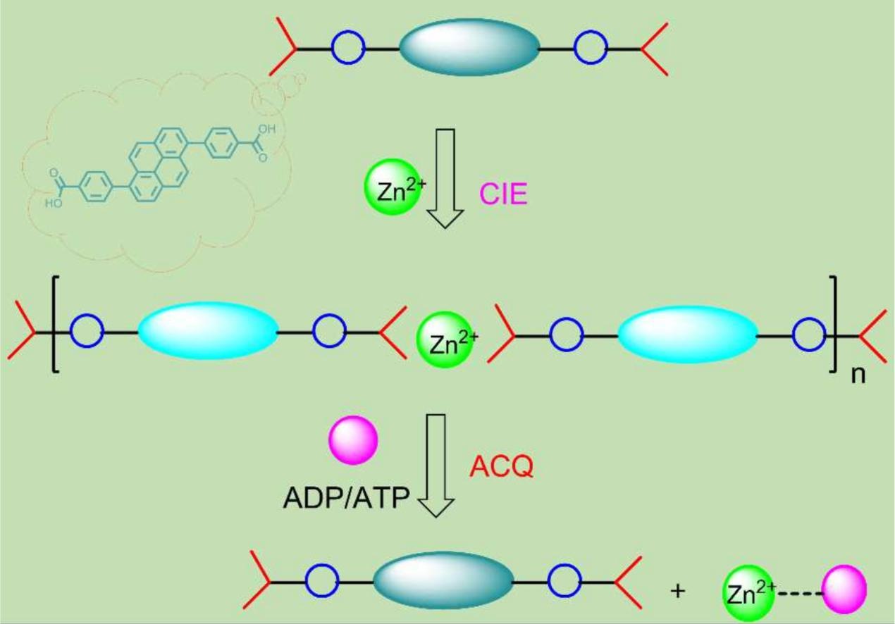 Qin等人以4,4′-(芘-1,6-二基)二苯甲酸(H2PDBA),在水热条件下构建了一种新的锌金属有机框架(MOF),即 {[Zn(PDBA)]-2(CH3)2NH}n (Zn-MOF,PDBA = H2PDBA 的去质子化), 并用于检测水中的 ATP 和 ADP,其选择性高,荧光淬灭反应时间短(1 分钟内)。经测量,ATP 和 ADP 的 Ksv 值和检测限分别为 7.83/8.78 × 103 M-1 和 0.82/1.71 μM。