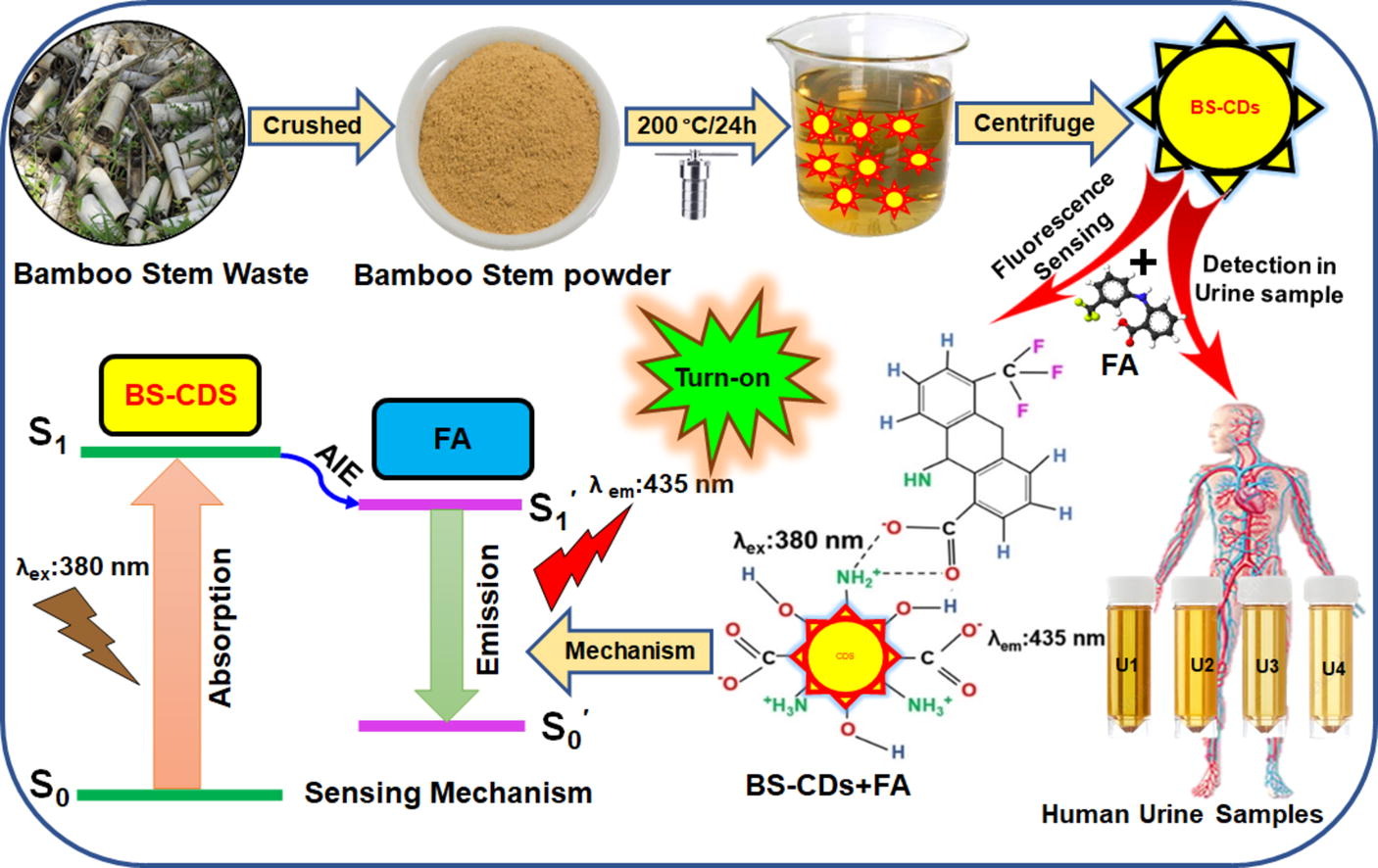 Thomas报告了一种新型荧光探针--竹茎废弃物衍生碳点(BS-CDs),用于高灵敏度检测有害消炎药氟芬那酸(FA)。在线性浓度范围(0.40 → 0.65 μM)内,BS-CDs 对 FA(400 μM)的检测荧光增强(∼2 倍),检测限(LoD;17 nM)和结合常数(Ka = 1.33 × 10-3 M-1)。人体尿液样本中 FA 的检测结果证明了 BS-CDs 探针的实用性,其回收率为 103% 至 109%。这表明所提出的基于 BS-CDs 的 "开启式 "传感器可用于测定生物液体中的 FA。