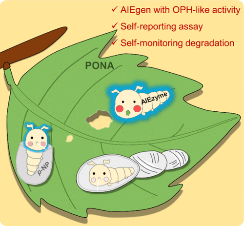 Han等人通过 Zr4+ 与 AIE 配体的简易配位聚合,设计并合成了一种具有固有类酶活性的 AIE 纳米材料(命名为 "AIEzyme")。AIEzyme 的有机磷水解酶(OPH)模拟活性具有极佳的亲和性和特异性。有趣的是,类似 OPH 的活性可以通过典型的有机磷神经毒剂(OPNA)--4-硝基苯磷酸二乙酯的水解物淬灭 AIEzyme 的固有荧光,因此建立了基于AIE酶的自报告荧光检测方法,该方法具有超高灵敏度、高选择性、良好的贮存稳定性和可接受的可靠性,可用于实际样品检测。