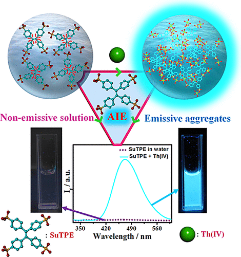 Singh等人报告了一种基于荧光团四(4-磺酸苯基)乙烯(SuTPE)的 AIE 的 Th(IV) 触发检测方法。作者利用 Th(IV) 诱导的 SuTPE 聚集和 SuTPE 发射特性的同时大幅增强,实现了在 100% 水介质中对 Th(IV) 的选择性传感。Th(IV) 的检测限估计为 240 nM(56 ppb)。