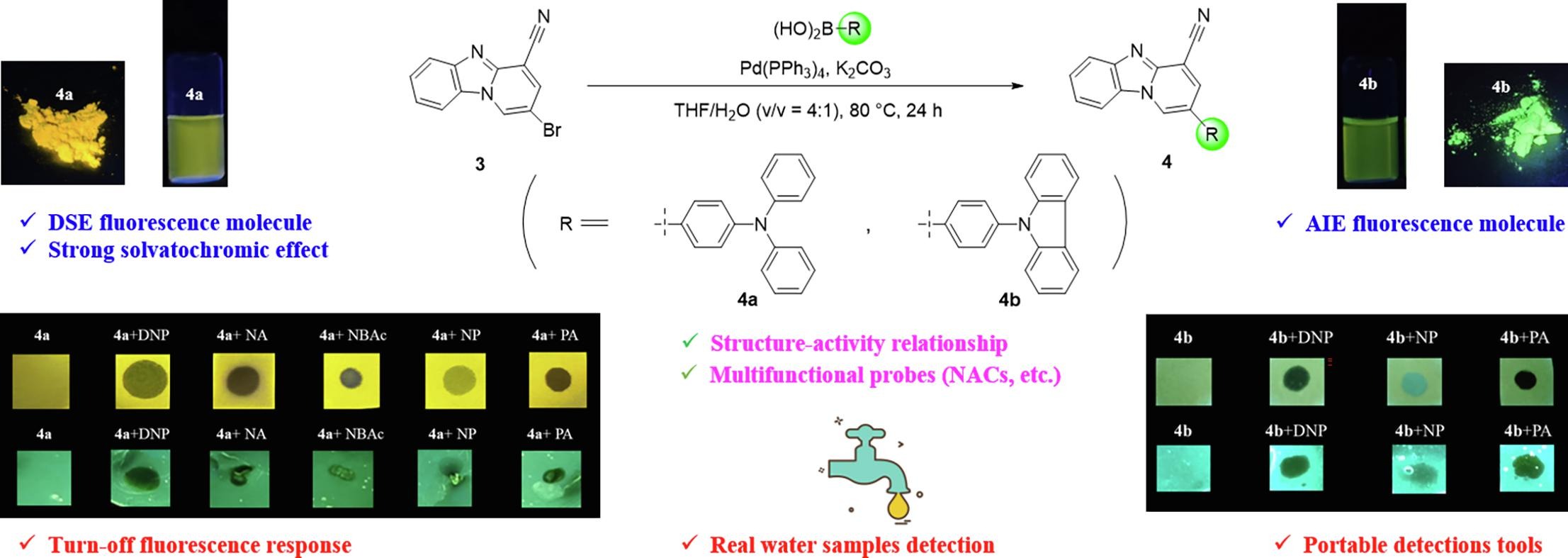 Wang等人合成了两种新型探针 4a 和 4b,这两种分子可以开发成多功能检测探针,并成功应用于铁离子和常见硝基芳香族化合物(NAC)的荧光识别。