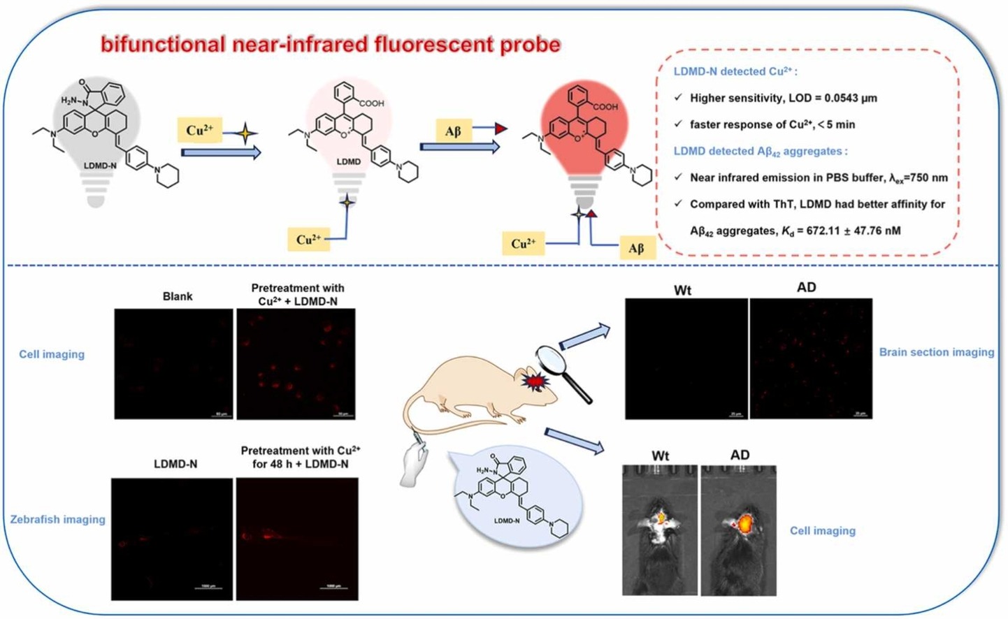 Yan等人采用 "Cu2+ 激活 "策略设计了一种新型双功能近红外(NIR)荧光探针 LDMD-N。LDMD-N 对体外 Cu2+ 的快速检测(5 分钟)和高灵敏度(LOD = 0.0543 µM)表现出色,并能对活细胞中波动的 Cu2+ 水平进行可视荧光成像。值得注意的是,我们利用该探针观察到 Cu2+ 促进了斑马鱼体内 Aβ42 的聚集。体内和体外染色实验表明,LDMD-N 能有效区分 AD 模型小鼠和野生型(Wt)小鼠。这种Cu2+激活的双功能近红外荧光探针为阐明Aβ42聚集体与Cu2+之间错综复杂的关系提供了一种很有前景的工具。
